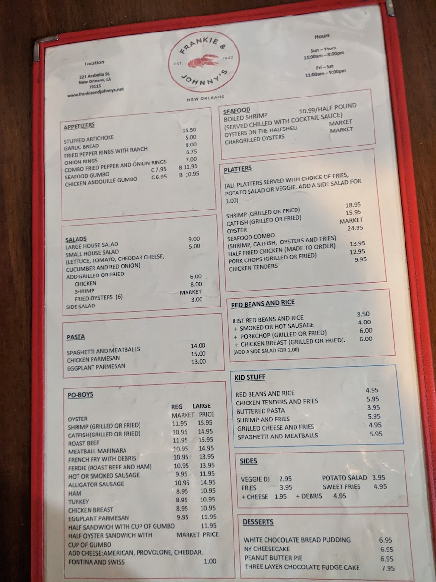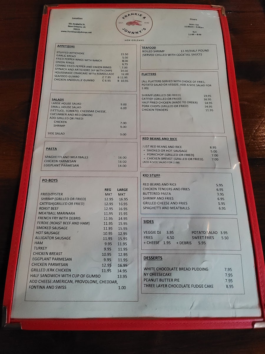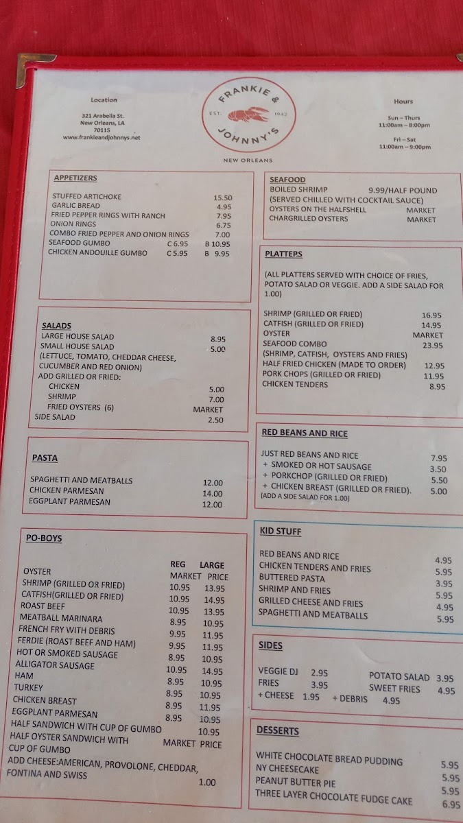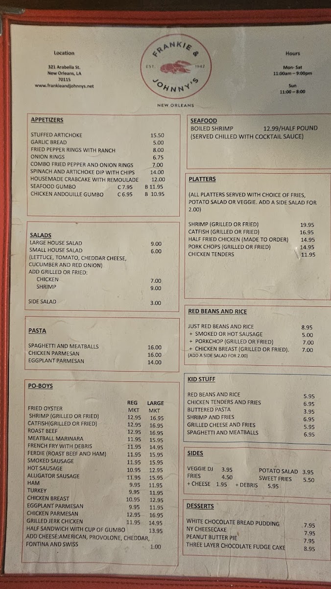 Welcome to Frankie & Johnny's, a vibrant culinary gem nestled in the heart of New Orleans at 321 Arabella St. This casual eatery offers a delightful blend of flavors that reflect the city’s rich culinary heritage. The menu is a mouthwatering tribute to comfort food, showcasing a variety of appetizers like crispy Onion Rings and stuffed Artichokes, perfect for sharing.